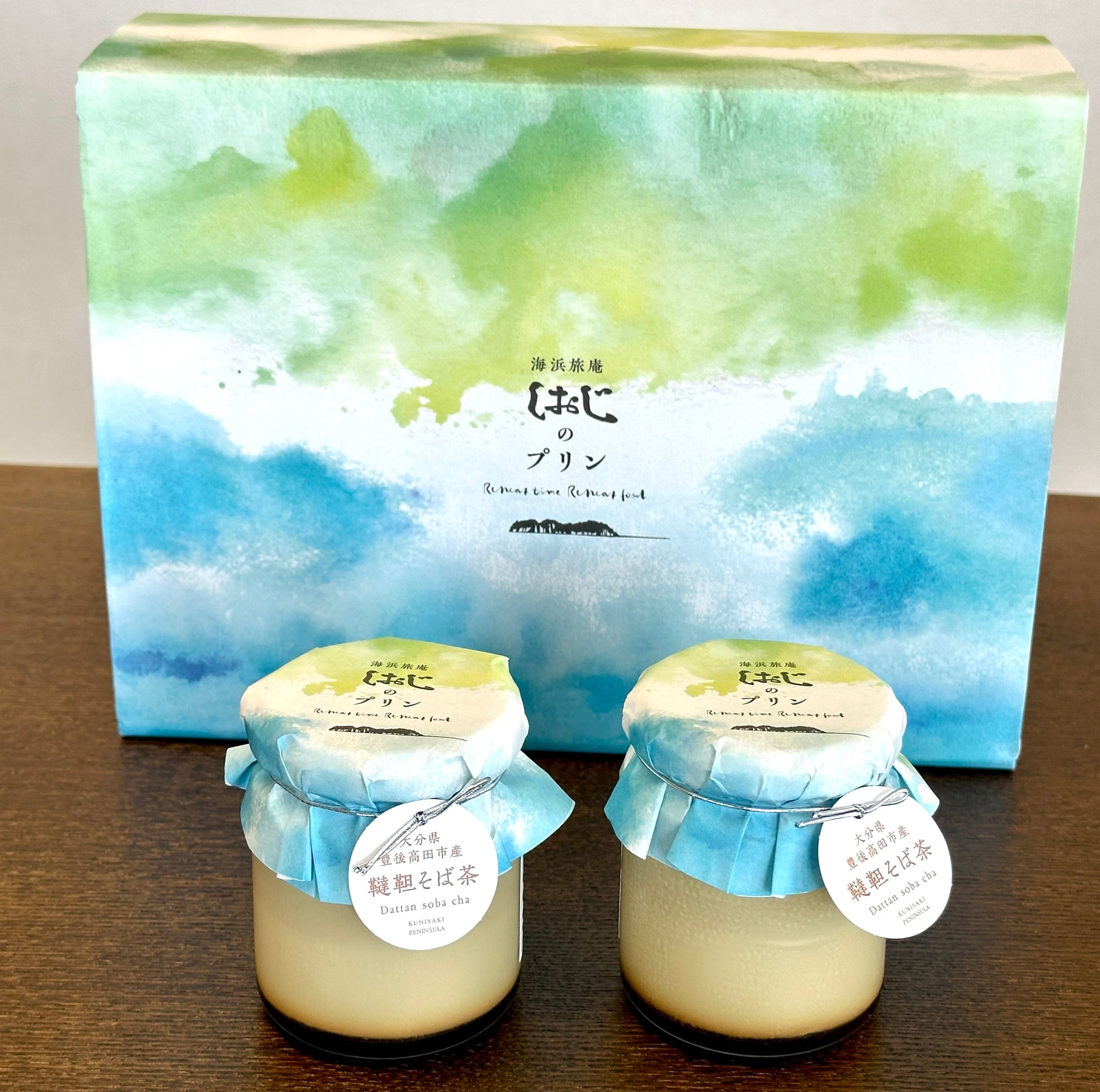 国東半島の海とトンボロ現象が見られる小島・馬ノ瀬を望む絶景の宿「海浜旅庵しおじ」でつくる豊後高田市特産の韃靼そば茶をふんだんに使ったプリン。